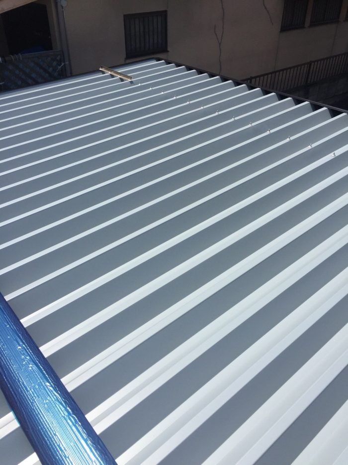 一般的なガレージやカーポートでは波板(ポリカーボネード板)が使われますが、折半ガレージでは屋根材がガルバリウム鋼板(スチール折板)を使用している為耐風圧に強い