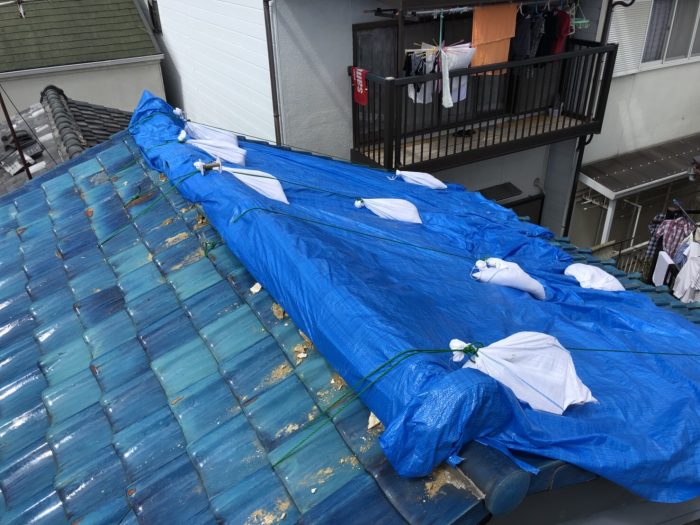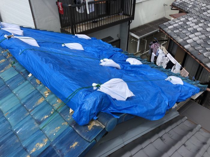 大阪府枚方市で台風の被害を受けた屋根に養生にやって来ました
