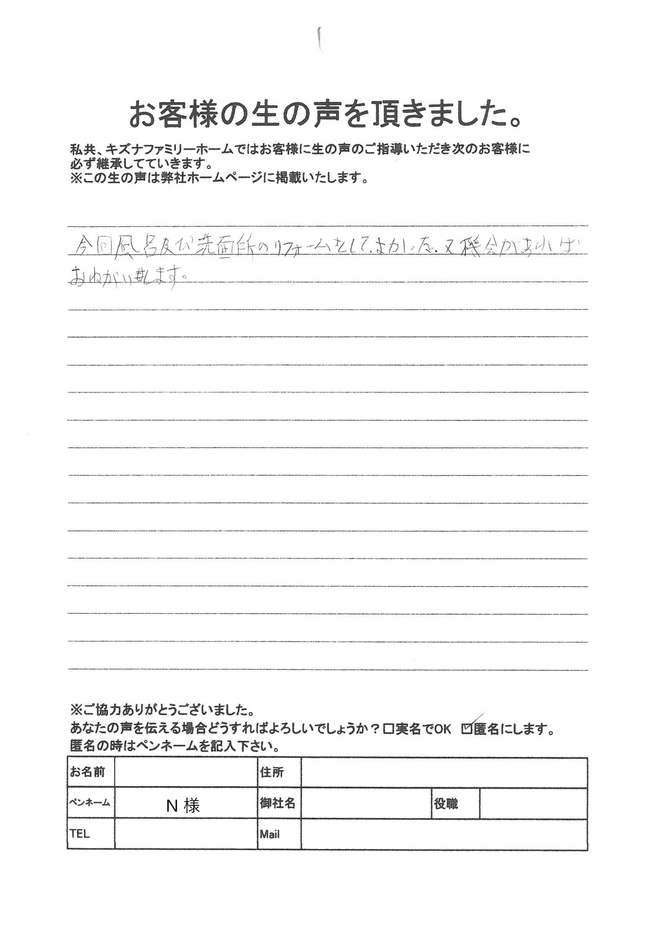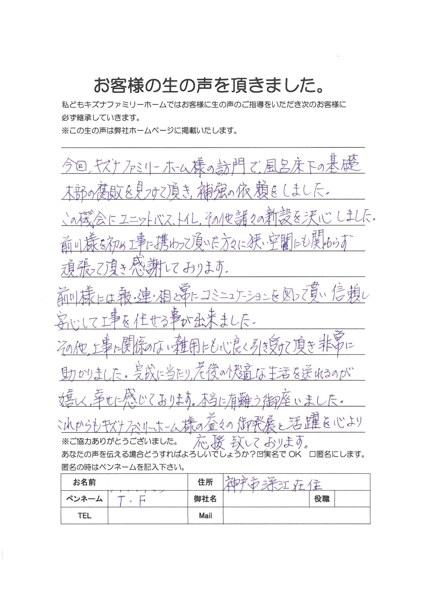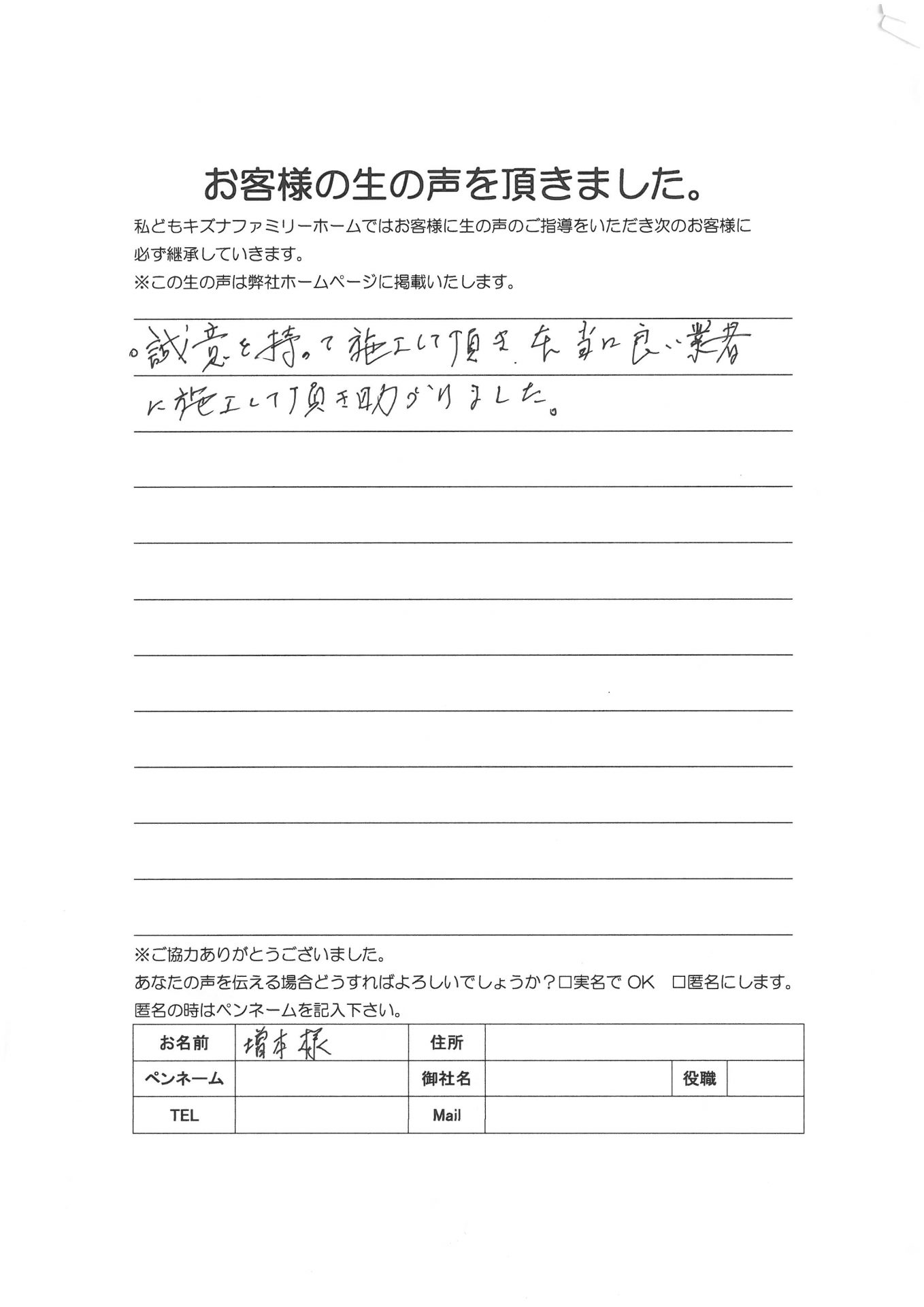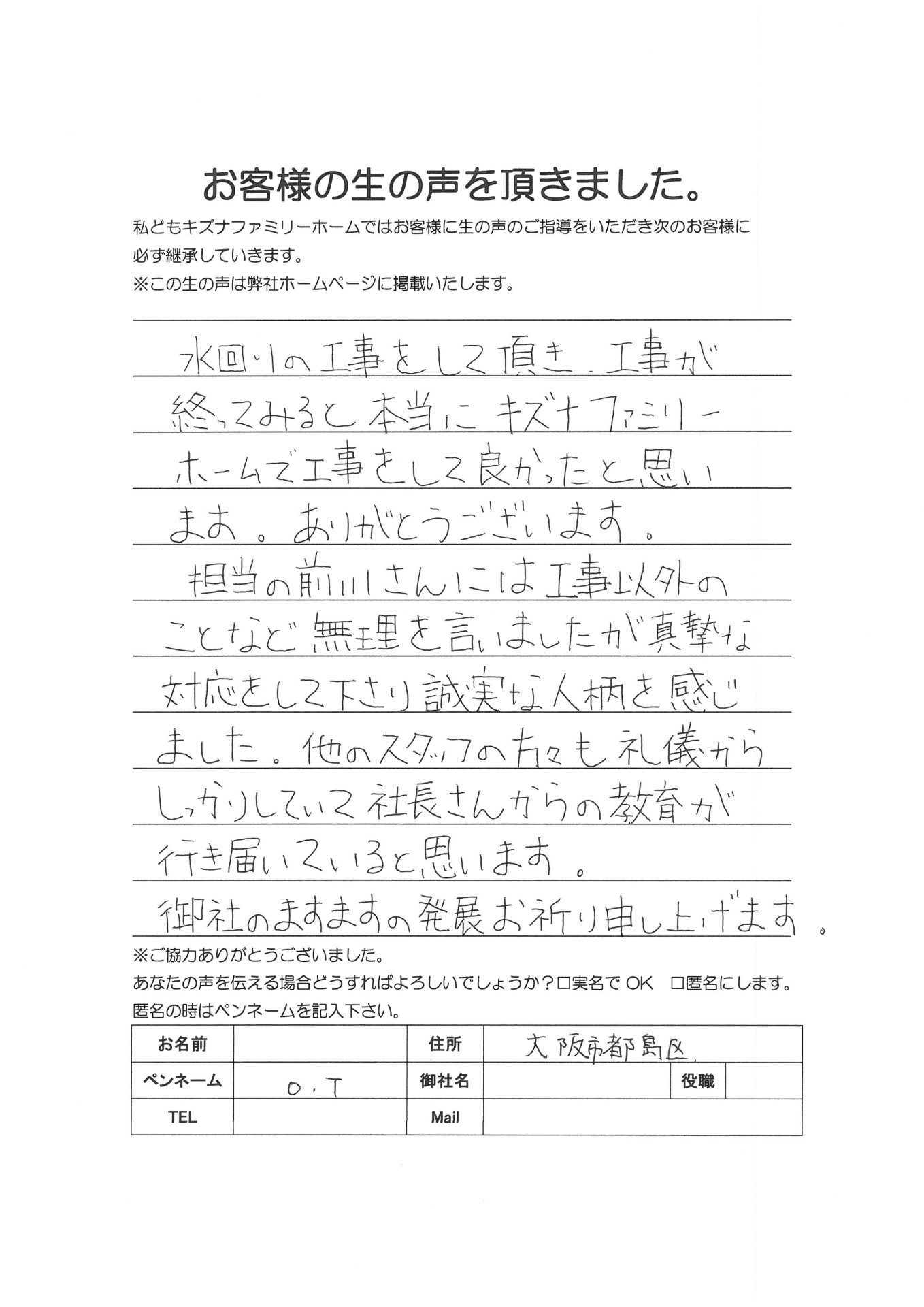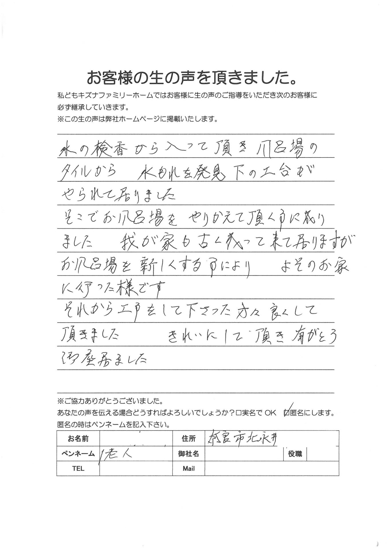 お客様の声 実際に施工させて頂いた”お客様の生のお声”です。 奈良市 T様 浴室タイル張替工事でお世話になり貴重な声を頂きました... 奈良市 T様 浴室タイル張替工事 京都府八幡市 目方様 ToToサザナ浴室改装工事でお世話になり貴重な声を頂... 八幡市 目方様 ToToサザナ浴室改装工事 大阪府高槻市 増本様邸 外壁塗装工事でお世話になり貴重な声を頂きました... 増本様 高槻市 大阪市旭区 N様 浴室脱衣場改装工事でお世話になり貴重な声を頂きました... 大阪市旭区 N様 大和高田市 藤本様邸 浴室・脱衣場改装工事でお世話になり貴重な声を頂きまし... 大和高田市 藤本様邸 浴室・脱衣場改装工事 大阪市都島区 O様 キッチン交換・キッチン床張り替え工事でお世話になり貴重... 都島区 O様 キッチン交換・キッチン床張り替え工事 大阪市北区 K様 外壁塗装・屋根塗装工事でお世話になり貴重な声を頂きました... 大阪市北区 K様 外壁塗装・屋根塗装工事 神戸市灘区 T様 浴室・脱衣改装・給湯器交換工事でお世話になり貴重な声を頂... 神戸市灘区 T様 京都市右京区A・R様床下浸水改善工事でお世話になり貴重な声を頂きました... 大阪市此花区O・K様瓦屋根葺き替え工事でお世話になり貴重な声を頂きました... « 先頭«...678910...»最後 »