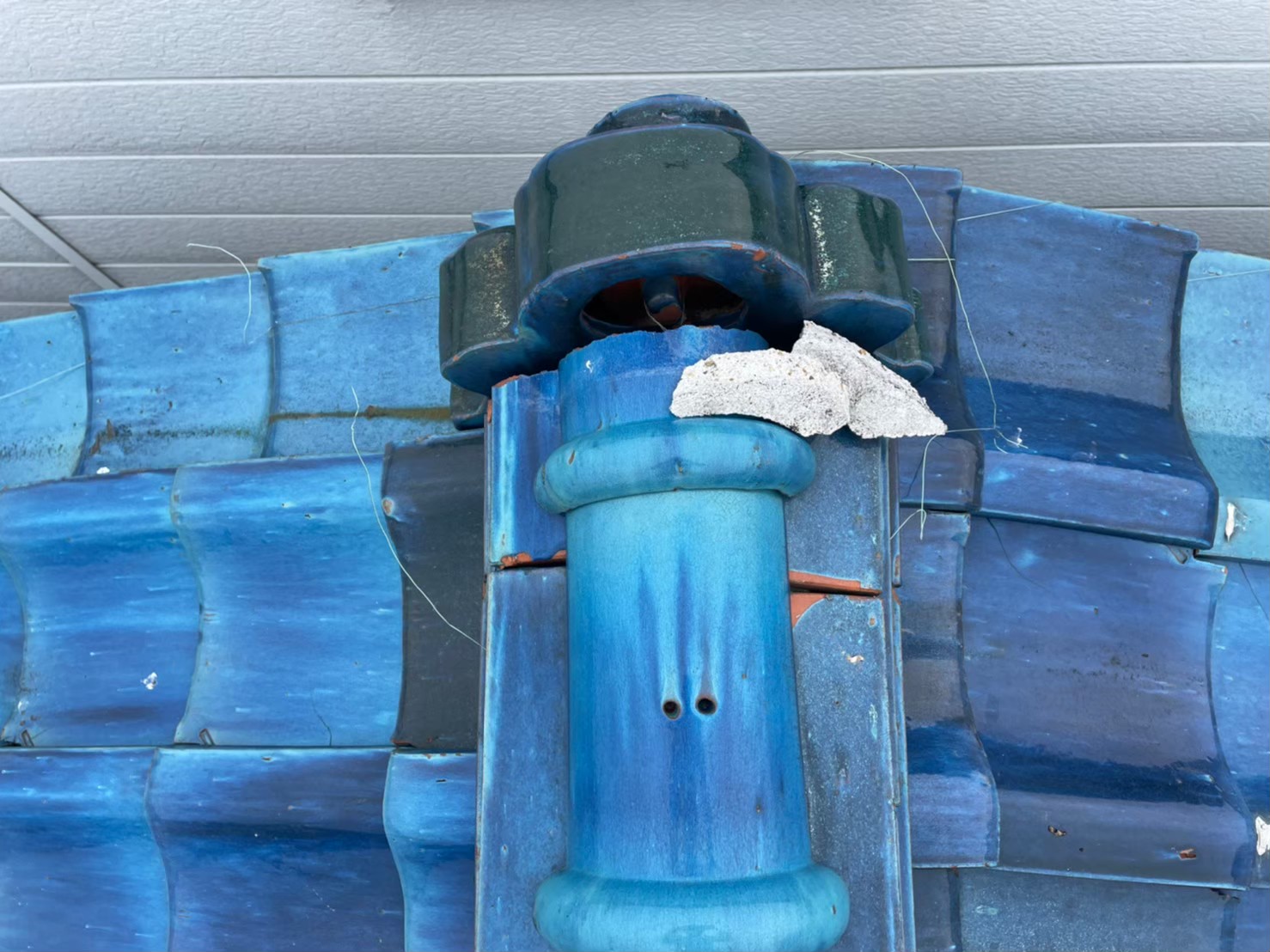 瓦の漆喰の変色、剥離(剥がれ)の破損による雨漏りの発生していたため 金属屋根のスーパーガルテクトに葺き替え工事を実施しました。