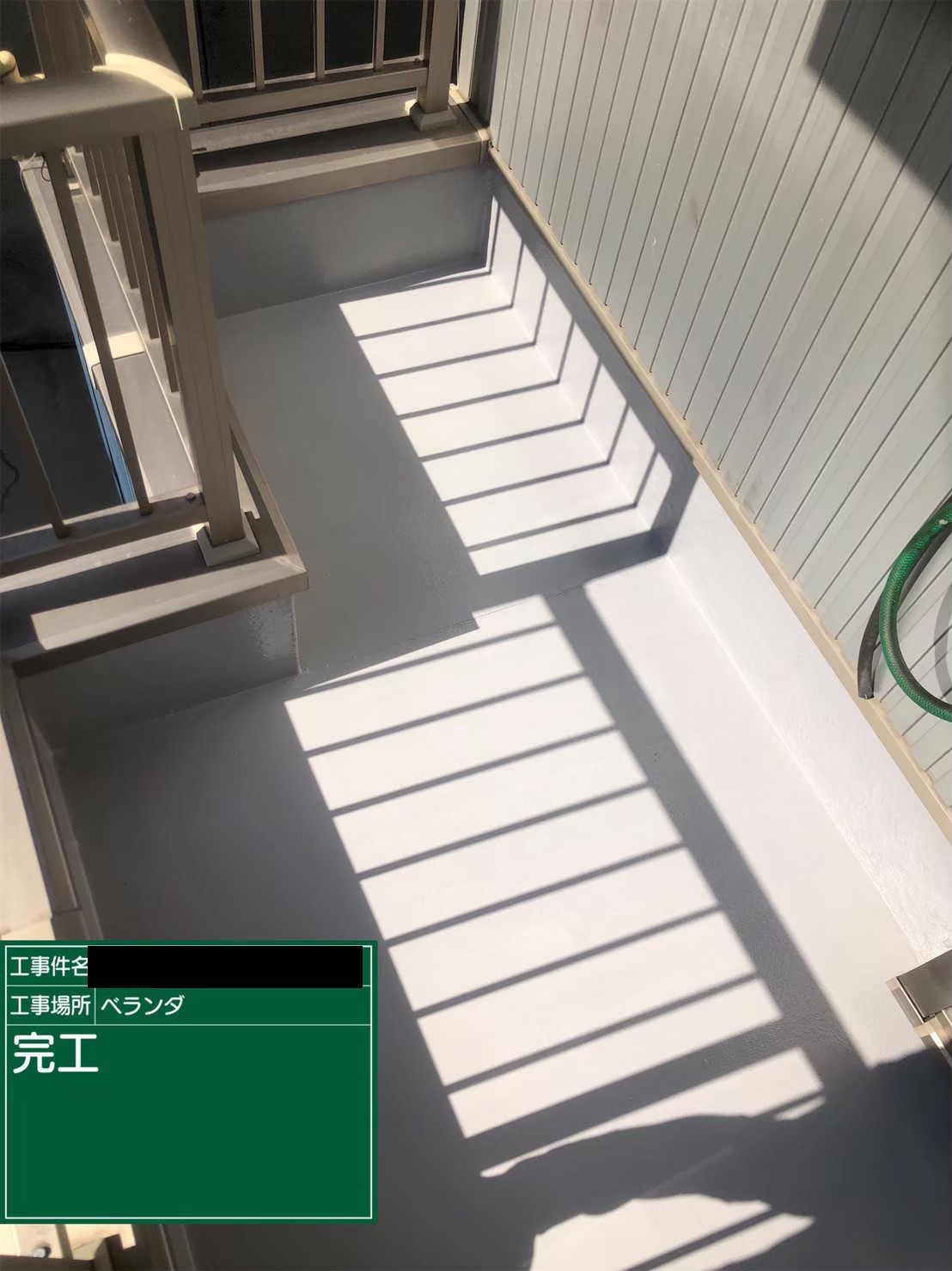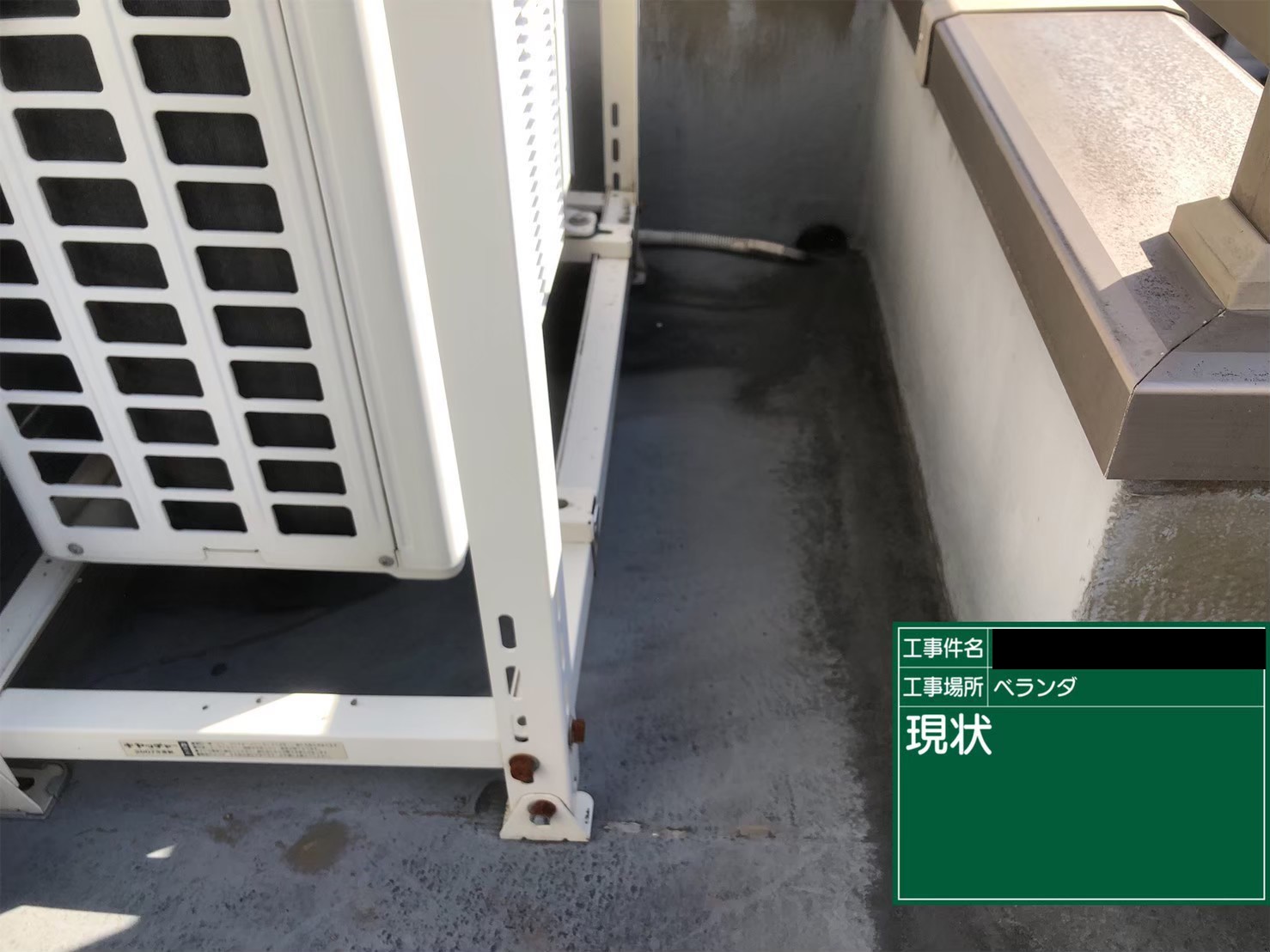 ベランダの水はけが悪く、表面のひび割れなどもあり 防水工事と下地補修を実施しました