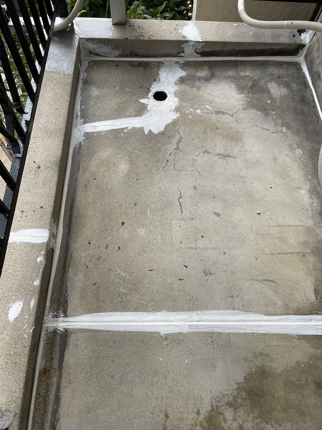 鉄部のサビとベランダのひび割れがあり、 水はけが悪いため、ベランダ防水と鉄部錆止め工事を実施