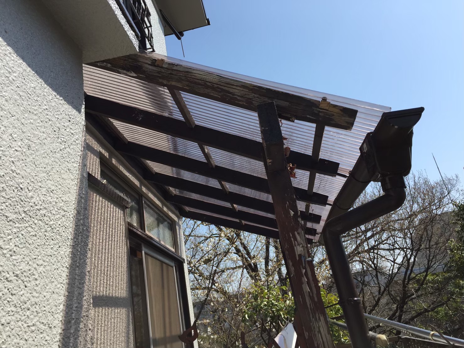 物置の波板の状態になります。 物置は木材で組まれているタイプで、年数が経つと木部の腐食が始まったりしますが、