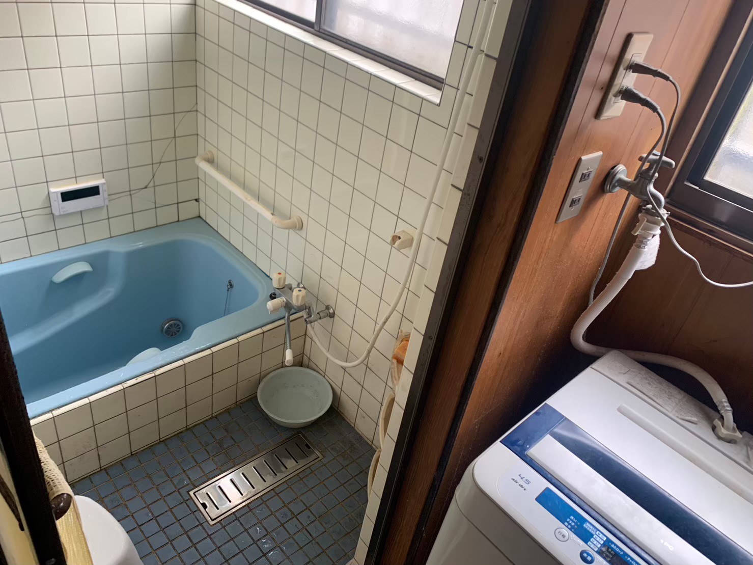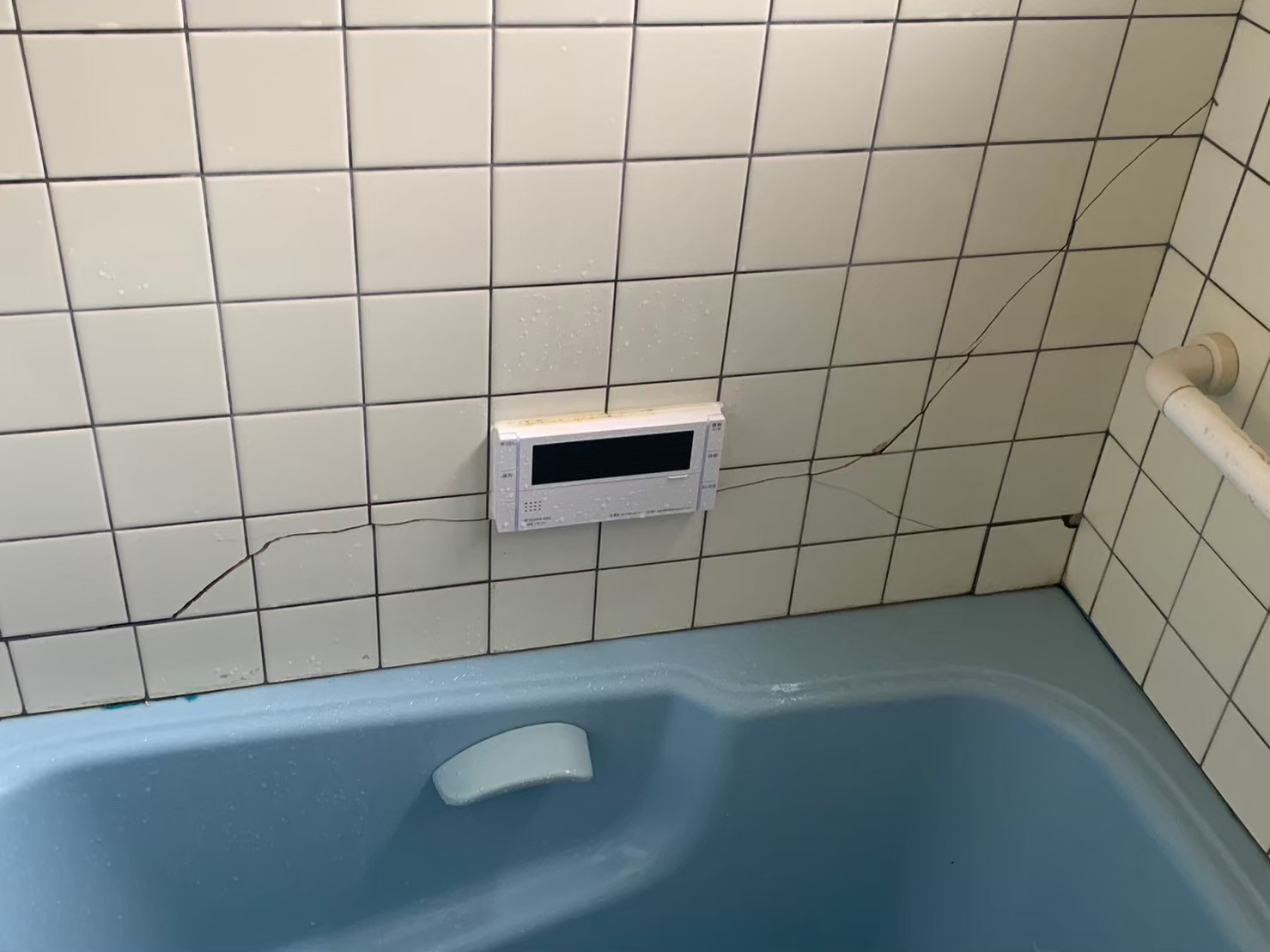 在来の浴室のタイルの浮きと剥がれ、目地の劣化、地震による壁のひび割れで 浴室タイルの張り替え工事を実施しました。