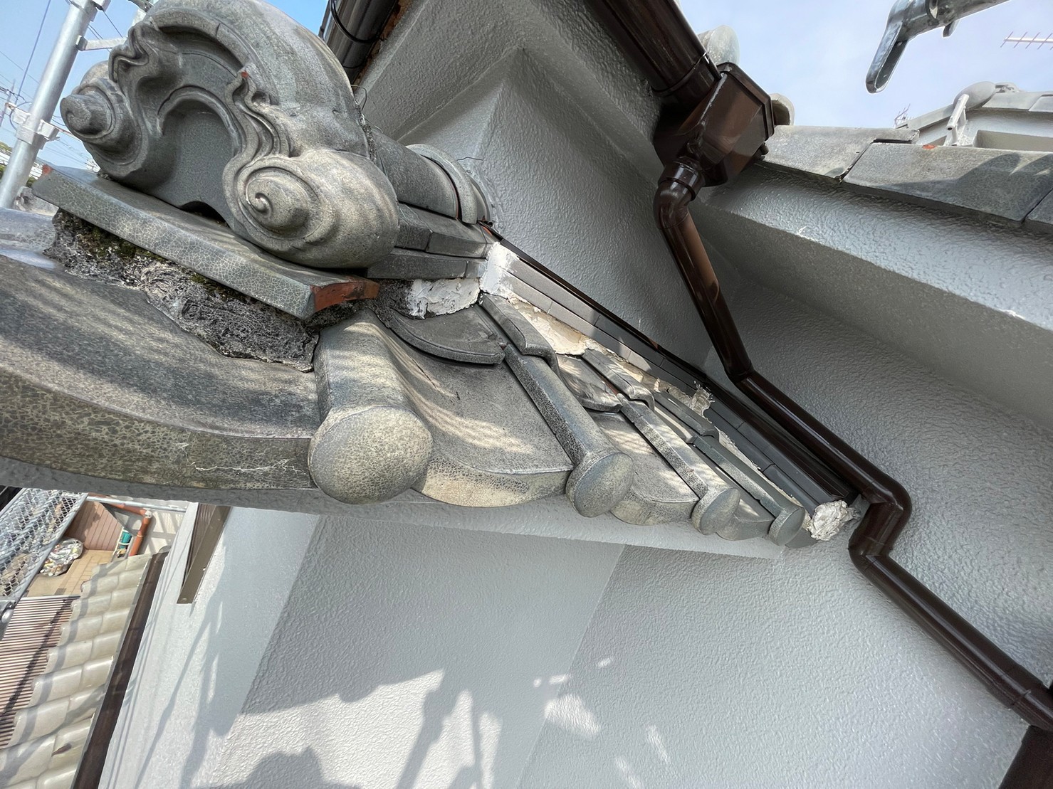 屋根漆喰には防水機能は無い為、隙間を埋めている箇所は奥3㎝から5㎝に詰めて雨水にあまり触れない箇所にありますが、何十年と紫外線や様々な天候の影響を受けます。