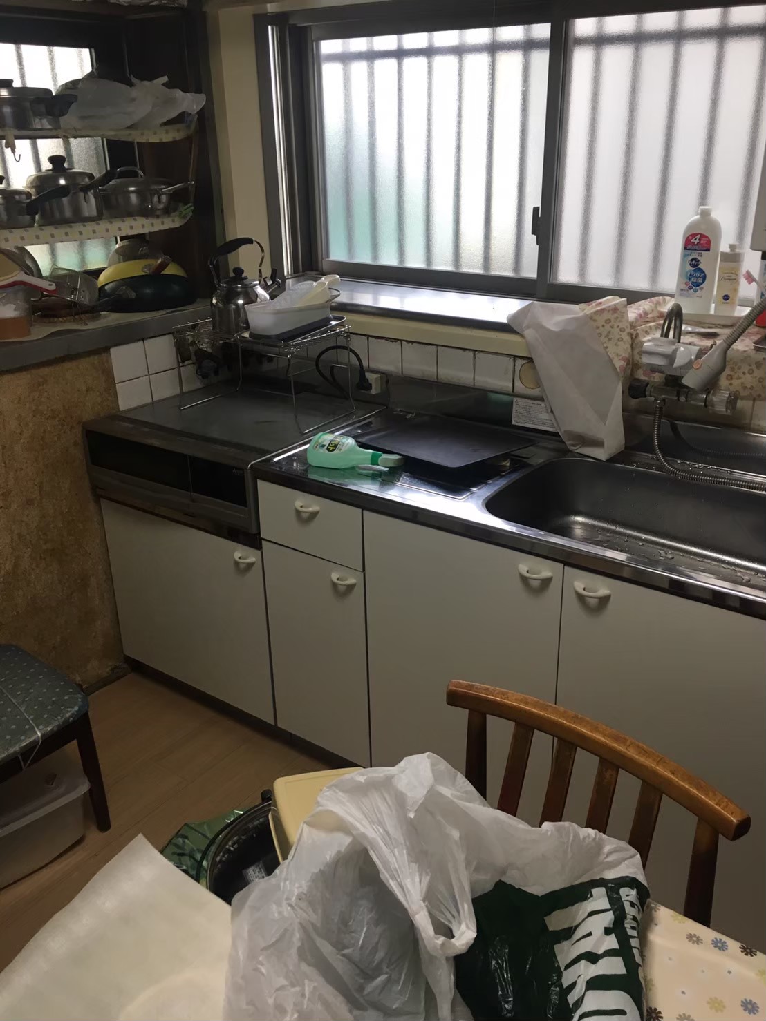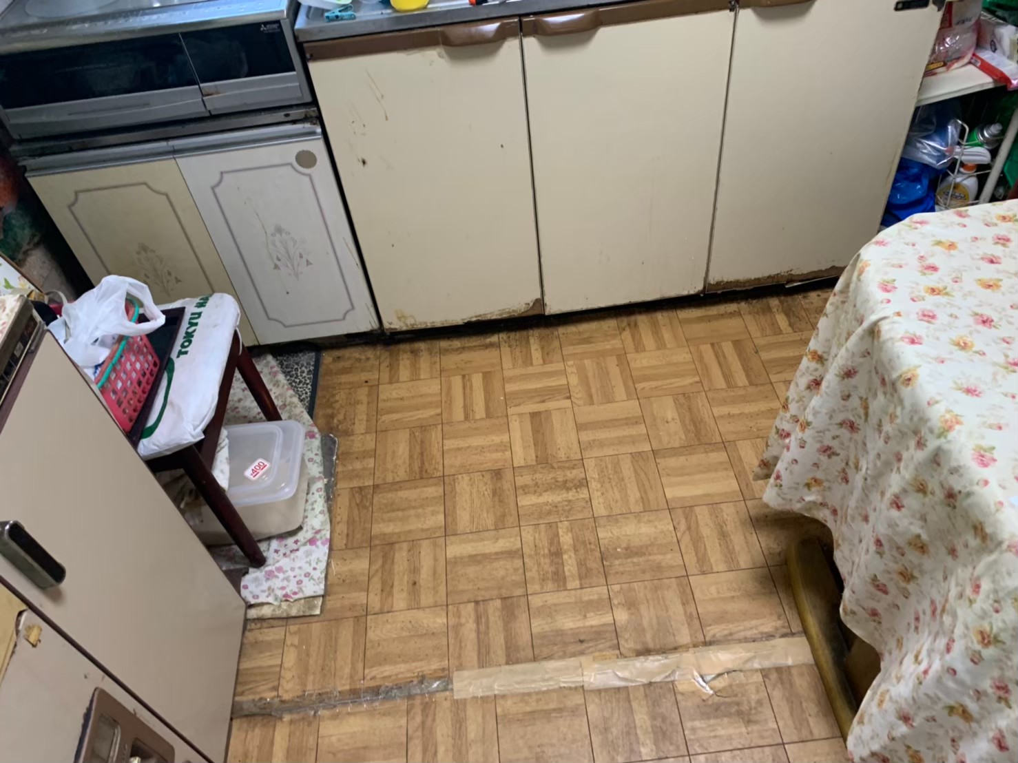 トイレ壁天井、床の張り替えと水染みの影響でキッチンの交換と床張替工事を実施
