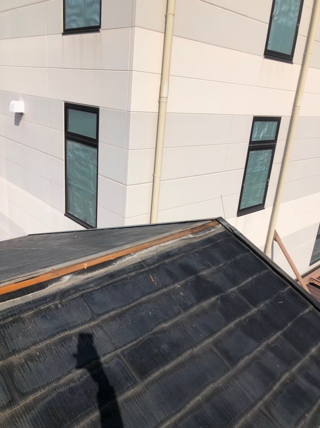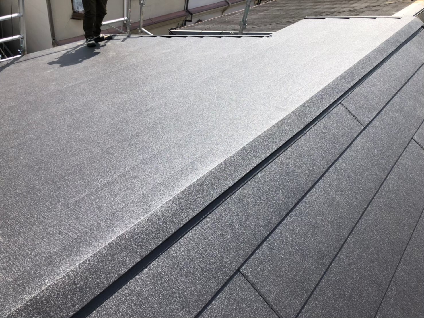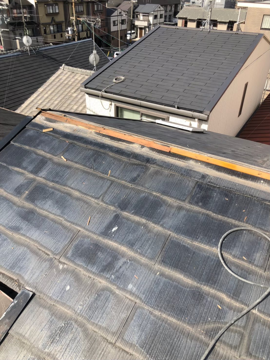 スレート屋根の棟板金の浮き、老朽化によるスレート屋根でしたが、 屋根下地がキレイだった為、屋根カバー工法を実施しました。