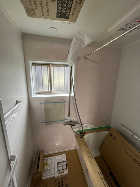 ユニットバスを組み立てた際の壁面の仕上げと壁クロスを こちらの工事は浴室のみの場合と脱衣場同時工事での工期の変動があります。 |