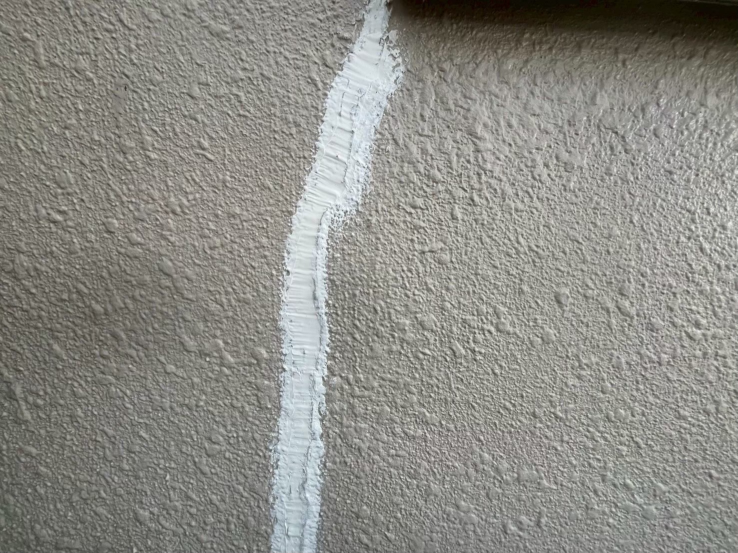 外壁全体にチョーキング(粉ふき)が発生しており、指で触ると白い粉が付着する状態でした。また、サッシ周辺や外壁の継ぎ目には細かなひび割れも確認。現地調査の結果、外壁塗膜の防水性能がかなり低下しており、雨水の浸入リスクが高まっていました。お客様には「今がまさに塗り替えの適正時期です」とご案内しました。 |