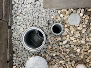 ・枡内部の汚れ・詰まり・破損状況を確認し、配管カメラで排水経路の詰まり具合をチェック。 ・枡の沈下がないか、周辺の土の状態や勾配の乱れもあわせて調査。 ・既存配管の径・高さを測定し、新しい樹脂枡との適合を確認。 |