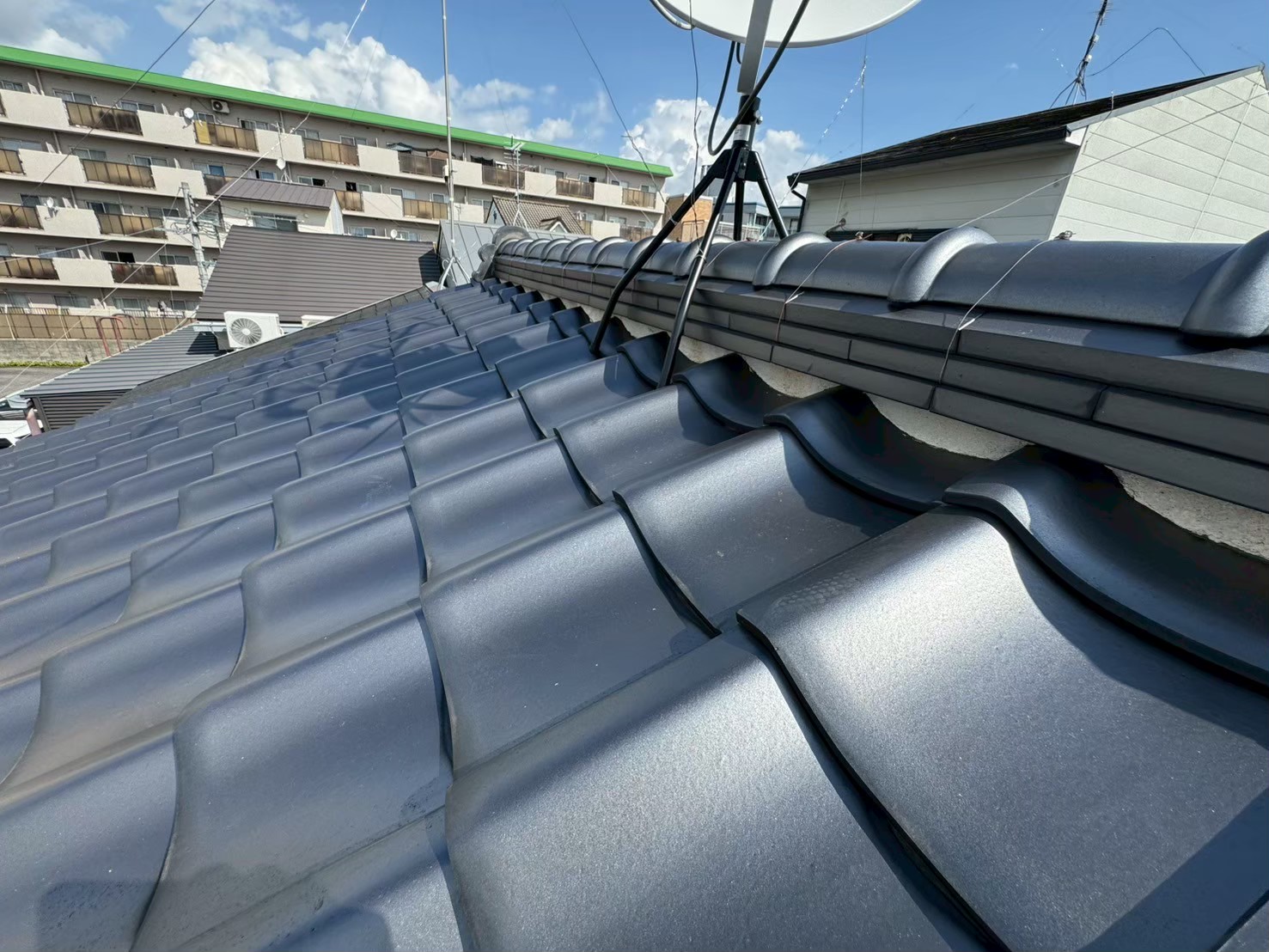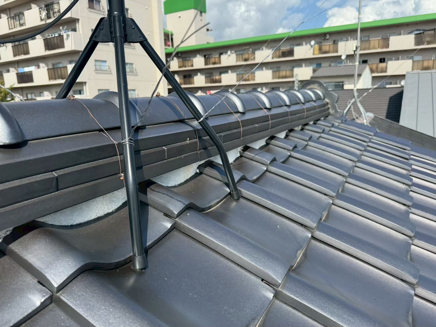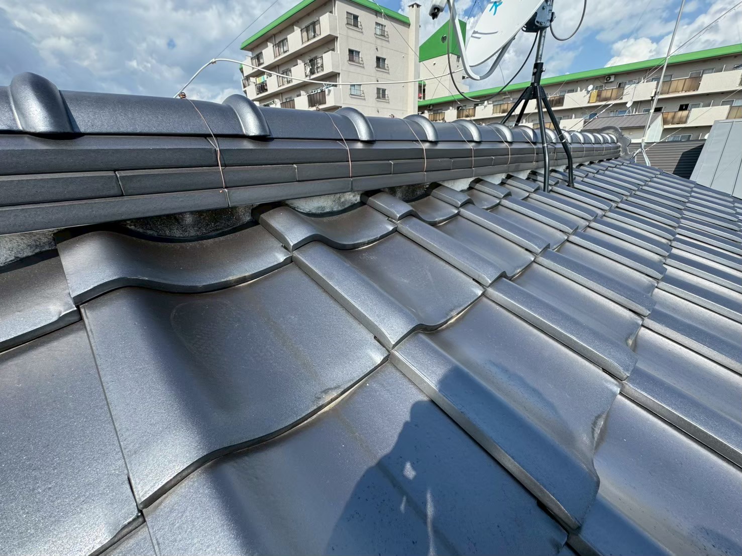 まず劣化している漆喰を丁寧に剥がし、雨水の浸入経路を確認しました。 職人が一つひとつの棟瓦を確認しながら作業を進め、均一で美しい仕上がりになるよう細部まで丁寧に施工しました。