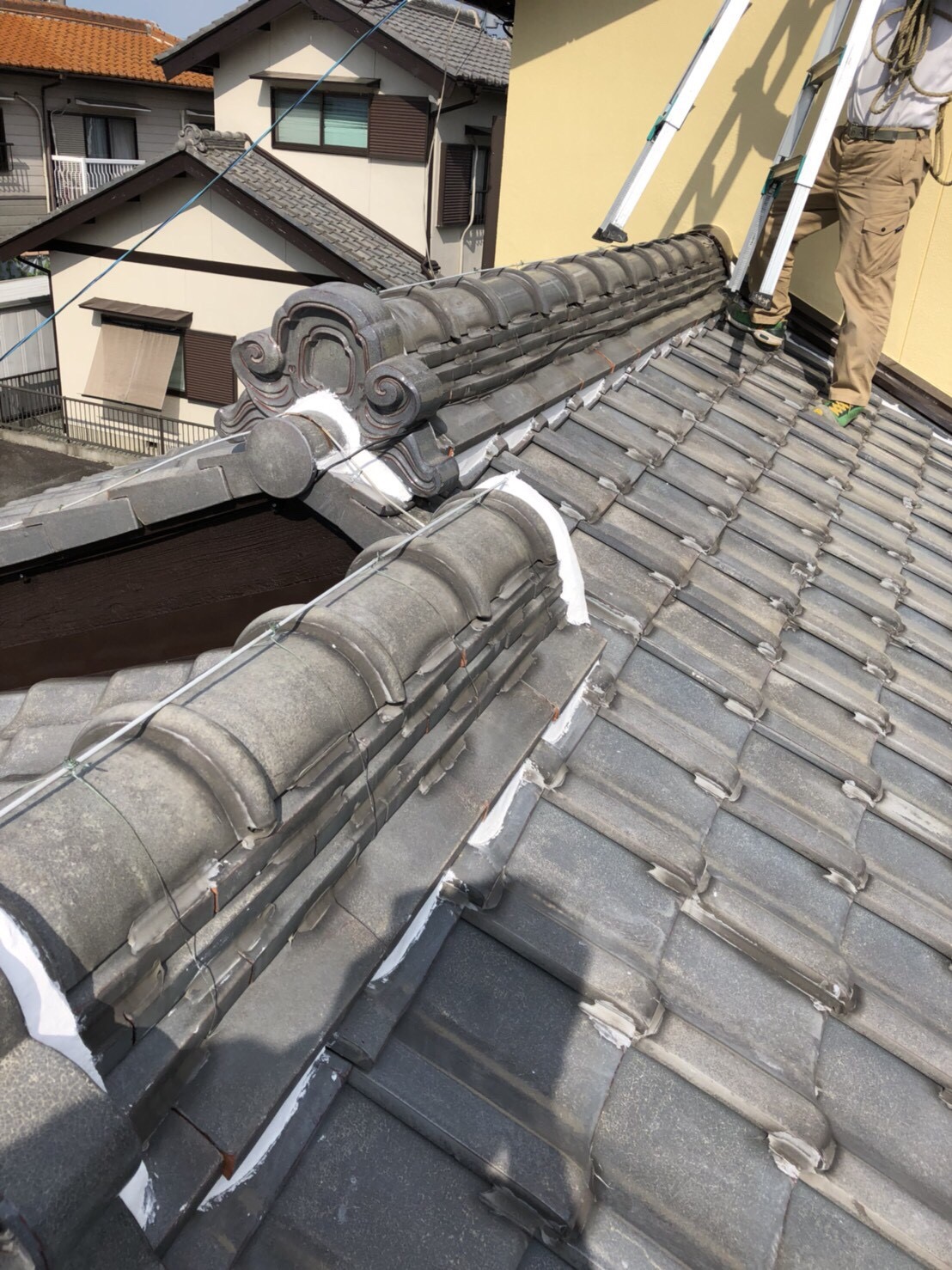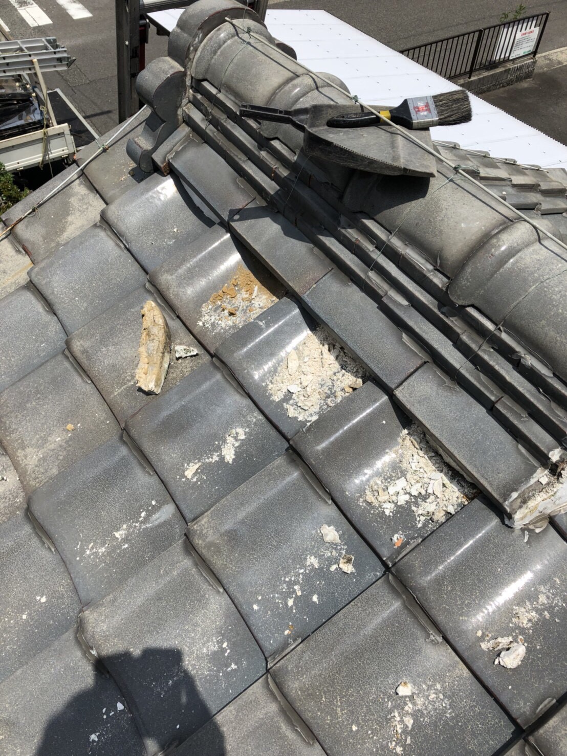 それらを防ぐために予算との相談の結果今回は棟部分は漆喰工事、瓦のズレはラバーロック工法で止めていきました。