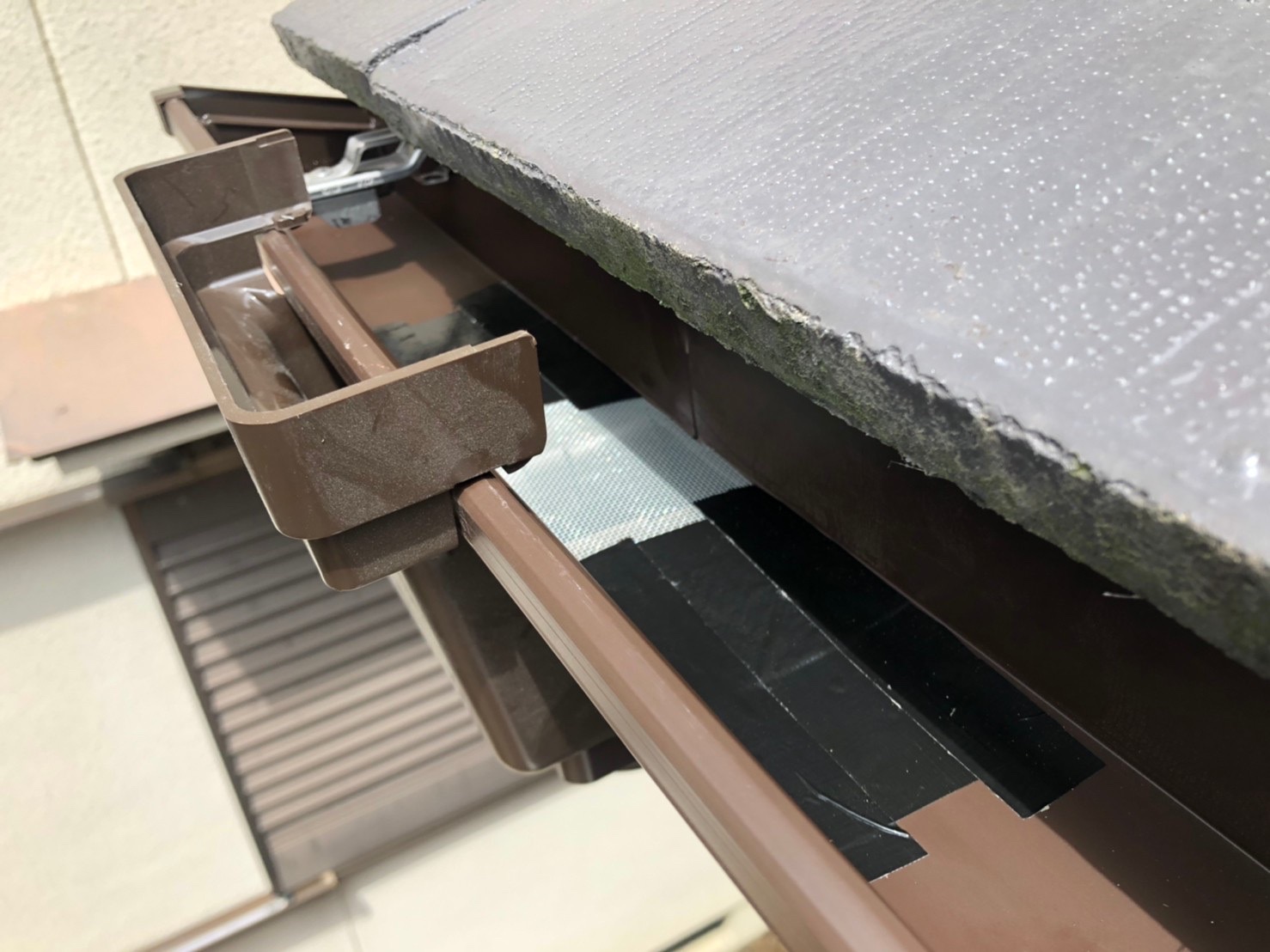 1階和室の雨漏りの原因は、雨樋の経年劣化による雨水の溢れから来るものでした。 問題の雨樋は新しいものに交換をし、軒先の隙間はコーキングで埋めました。
