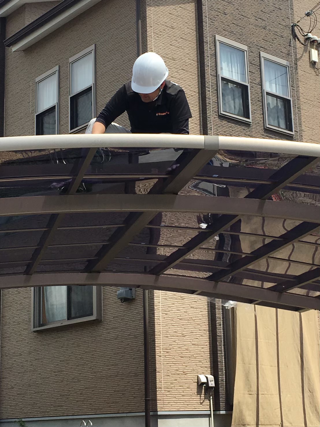 台風シーズンでは件数の多いカーポート、ベランダの波板の飛散。