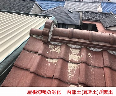 台風の影響で瓦が飛ばされた箇所、漆喰の劣化状況についてはこちらをご覧ください。