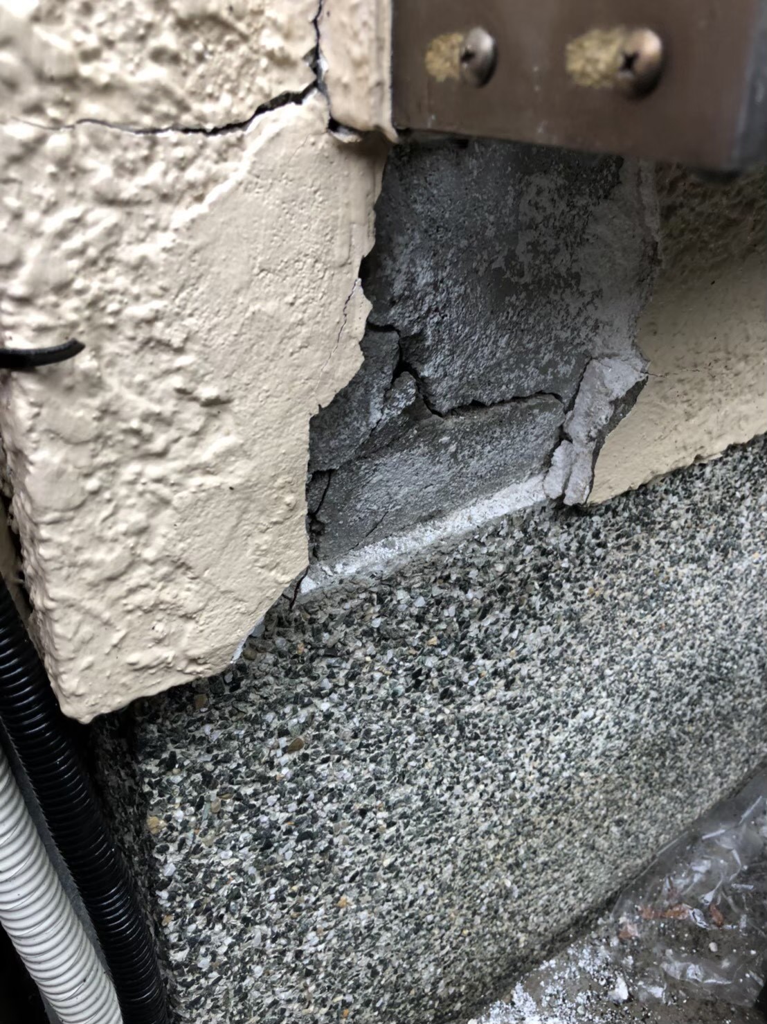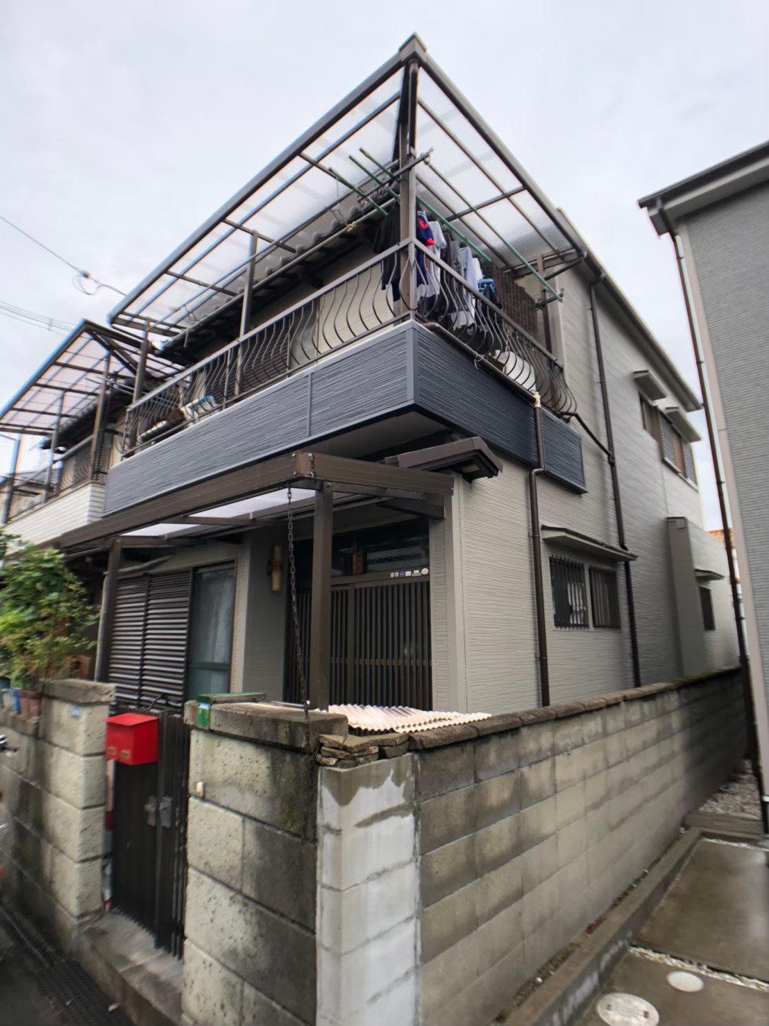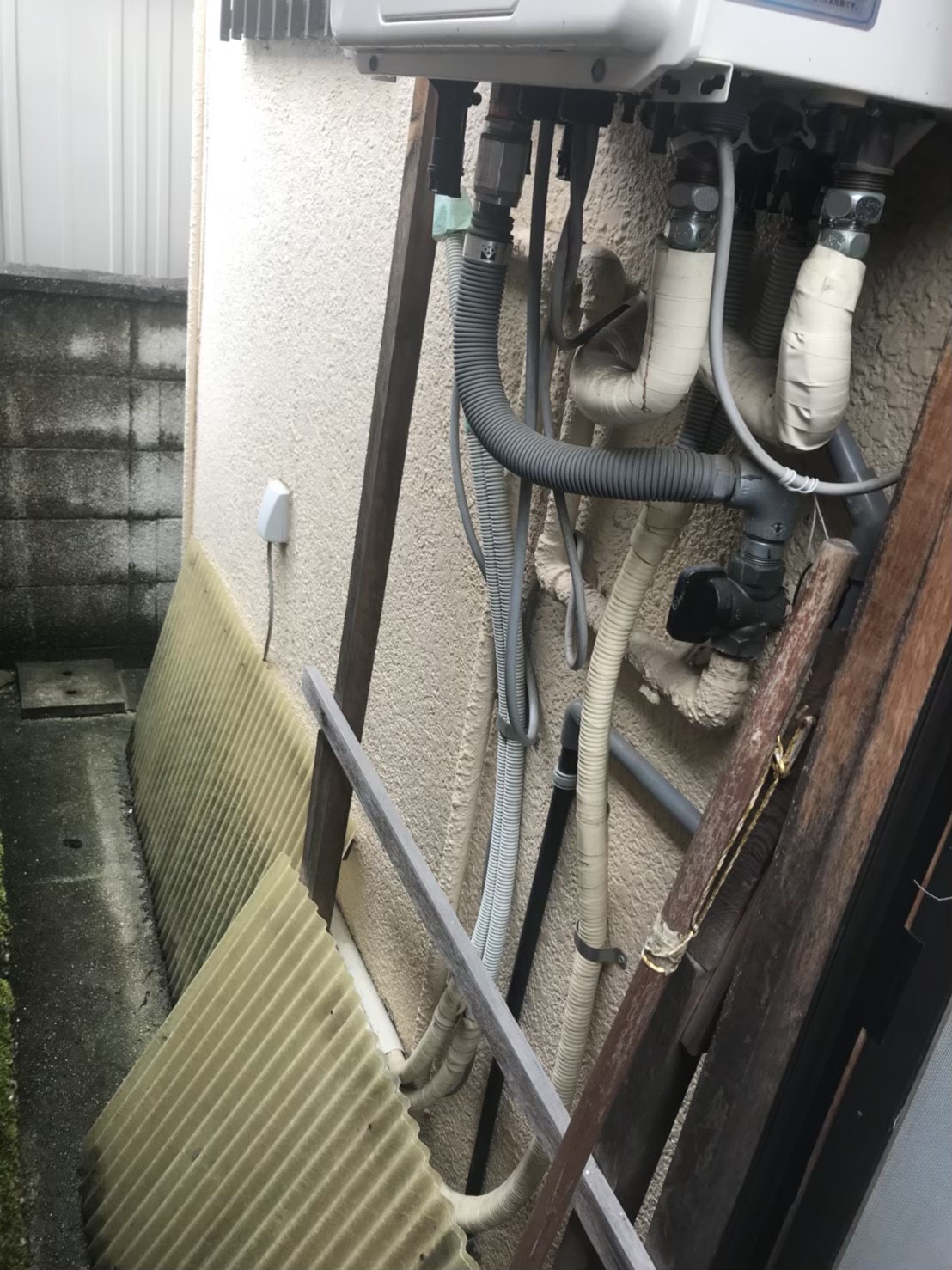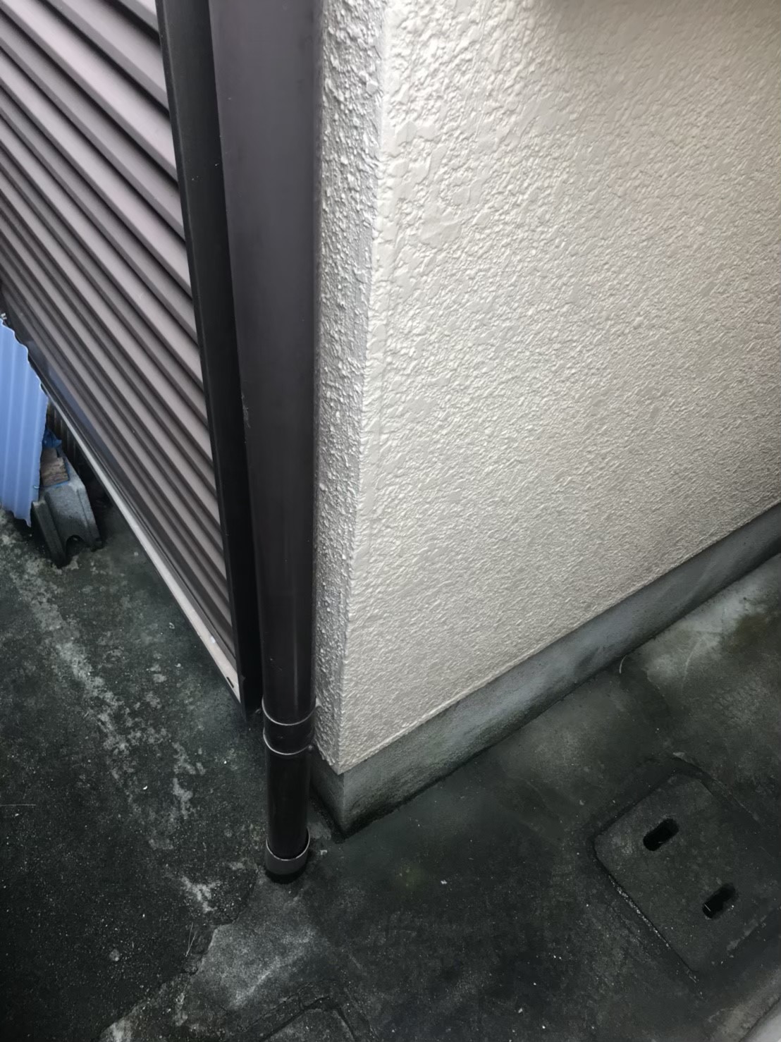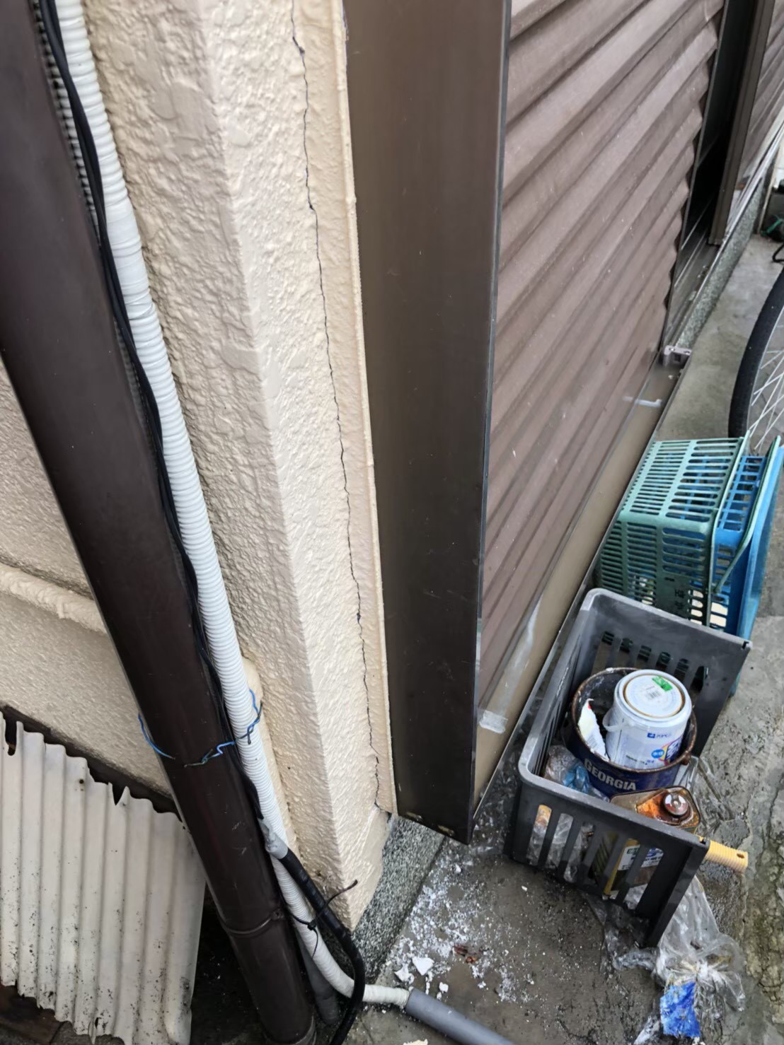 外壁のひび割れなどを補修、木部防腐塗装や配管部分の処理を実施し、