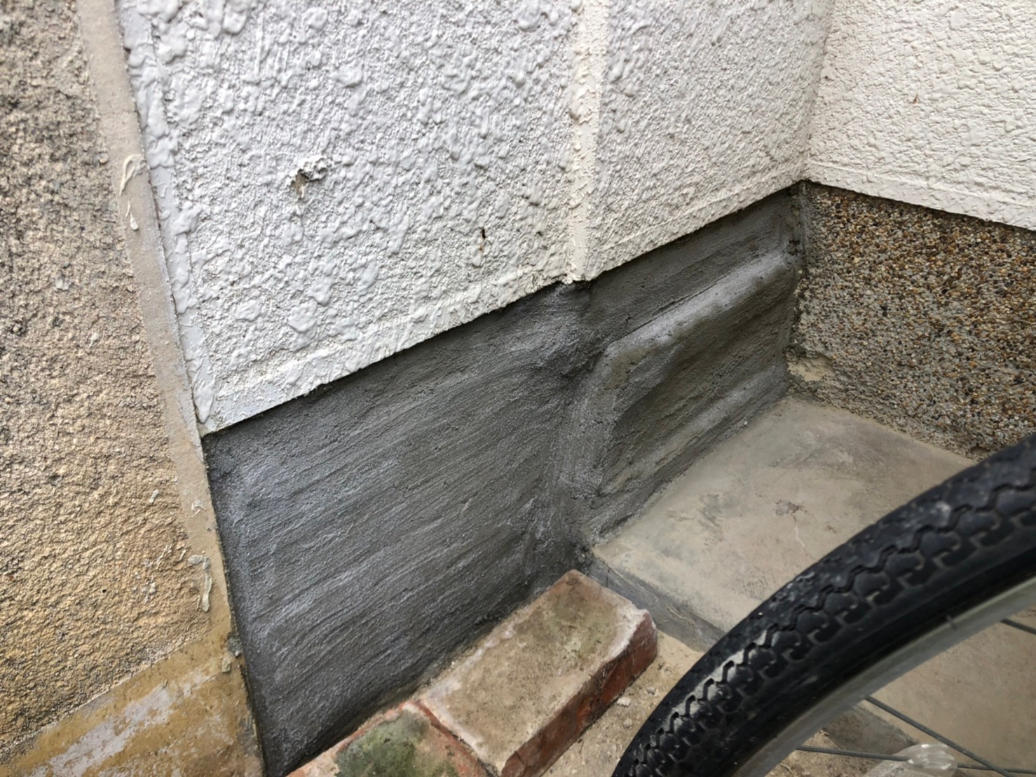 外の基礎の化粧面が剝離しており、お客様が心配なされお問い合わせを頂きました。 基礎の経年劣化が原因で、剝離していたのでアラミド繊維シート基礎補強を実施。 基礎部分の左官を行い、住宅基礎の補強を実施しました。